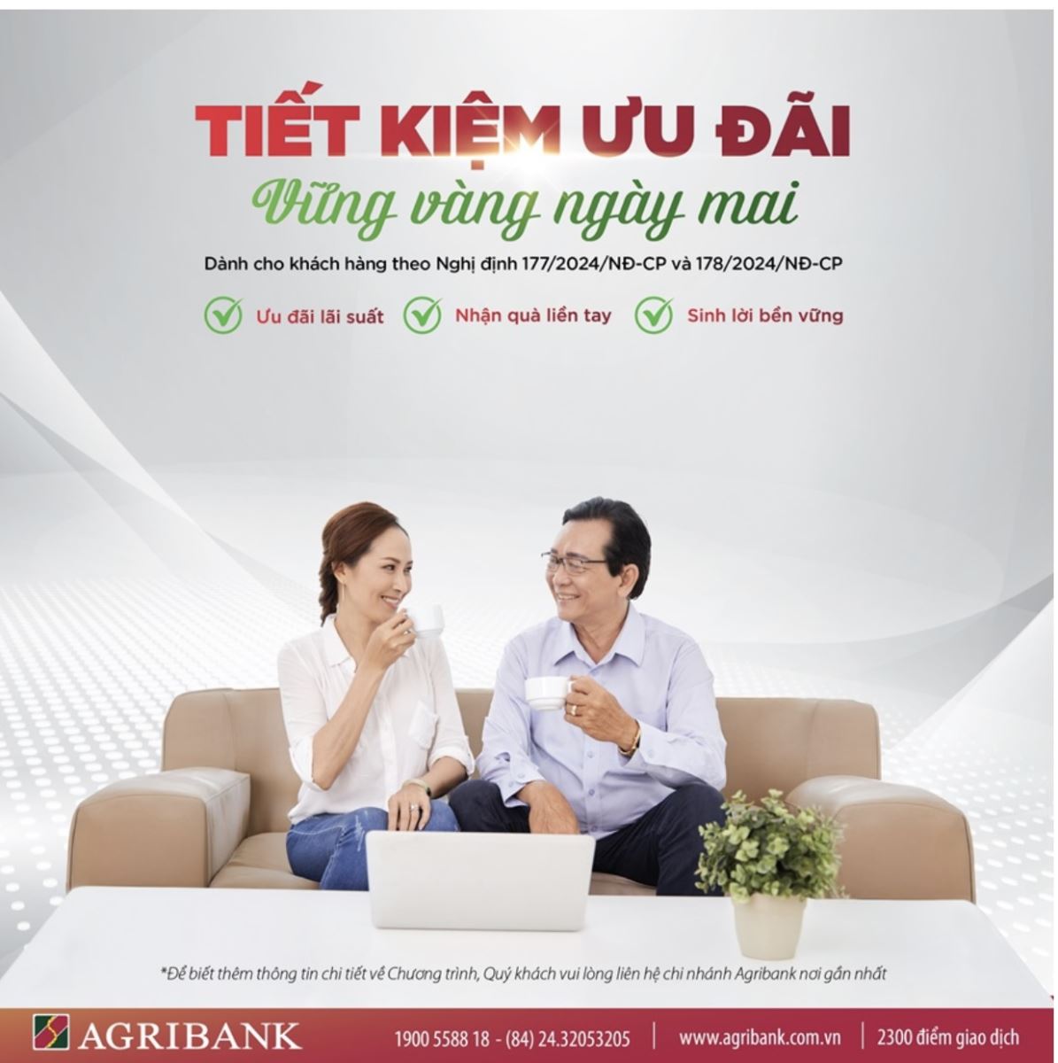 Với mong muốn đồng hành cùng khách hàng trong giai đoạn chuyển tiếp công tác, đồng thời giúp khách hàng an tâm hoạch định tài chính và tận hưởng cuộc sống trọn vẹn, Agribank triển khai chương trình “Tiết kiệm ưu đãi - Vững vàng ngày mai” với nhiều ưu đãi hấp dẫn, lãi suất cạnh tranh dành riêng cho khách hàng theo đối tượng Nghị định 177 và 178 của Chính phủ.