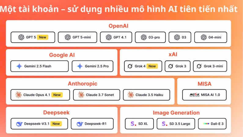 • Một tài khoản – sử dụng toàn bộ các mô hình AI tiên tiến nhất: Chỉ cần 1 tài khoản có thể sử dụng tất cả các mô hình AI hàng đầu như: ChatGPT, Gemini, Grok, DeepSeek, Claude, DALL-E, MISA AI…;